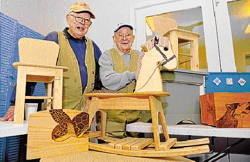 Doug Sinclair and Neil Dillon (pictured), who teach woodwork at the shed, show some of the toys made by the group.